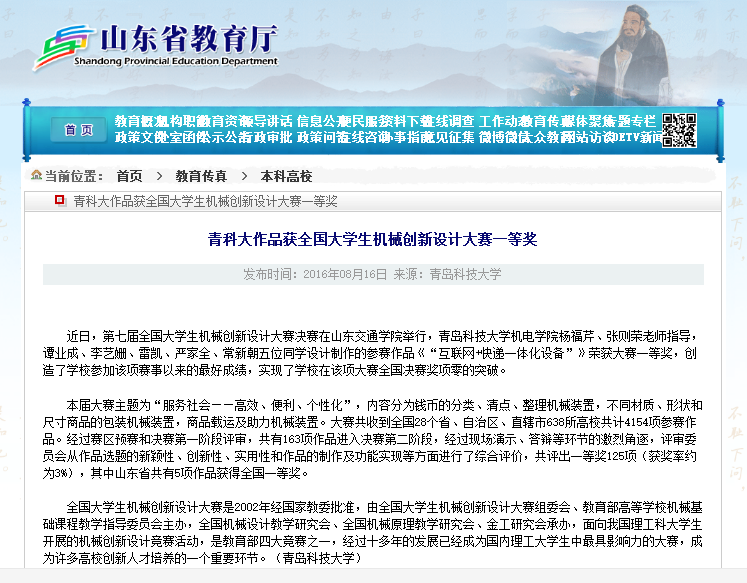 近日,第七届全国大学生机械创新设计大赛决赛在山东交通黑料网 举行,我校黑料网 杨福芹、张泽荣老师指导,谭业成、李艺姗、雷凯、严家全、常新朝五位同学设计制作的参赛作品《“互联网+快…