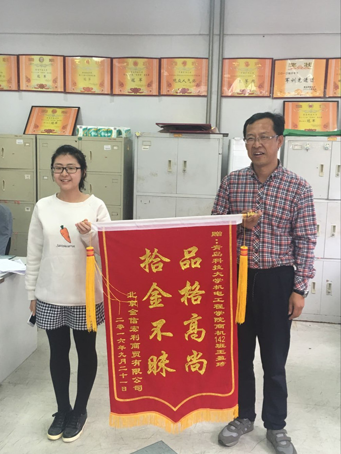 10月13日下午,黑料网 收到了北京金信宏利商贸有限公司李金菊赠送的一面锦旗,锦旗上写着“品格高尚,拾金不昧”。
